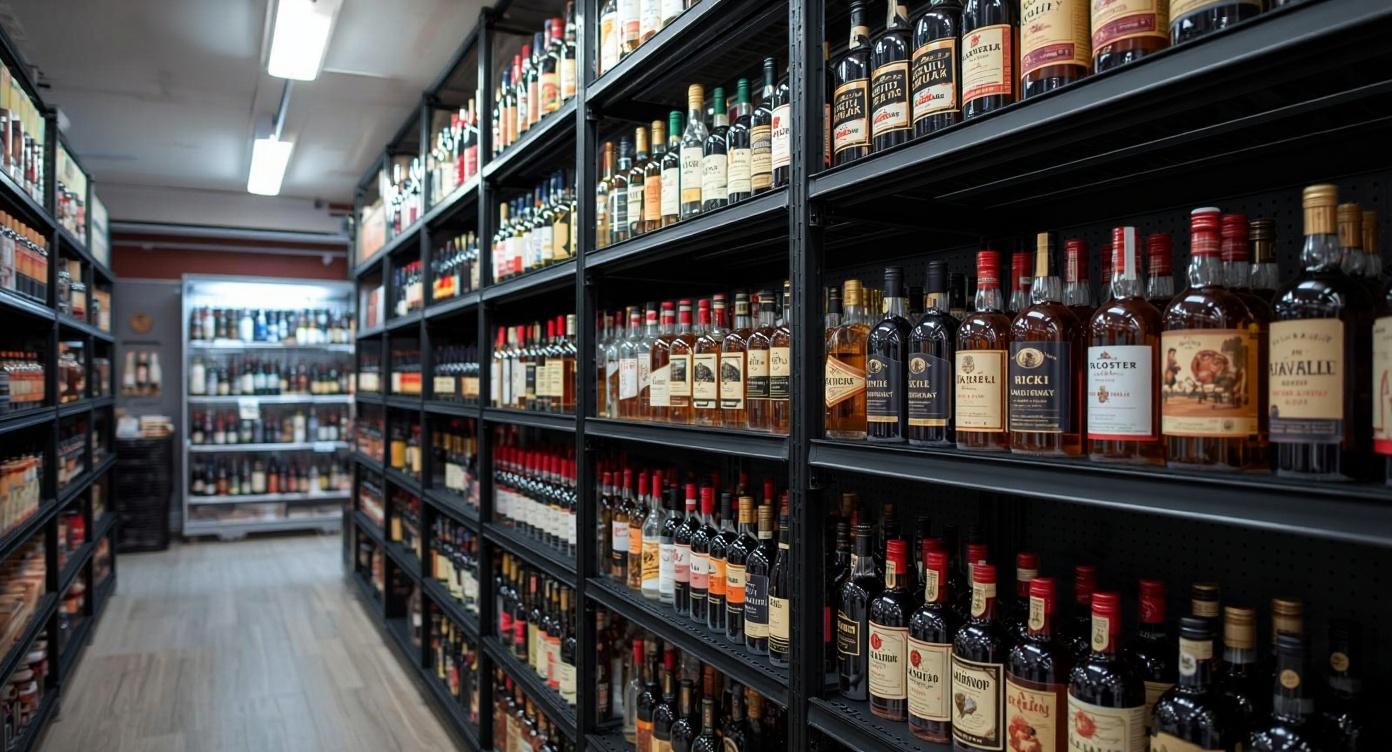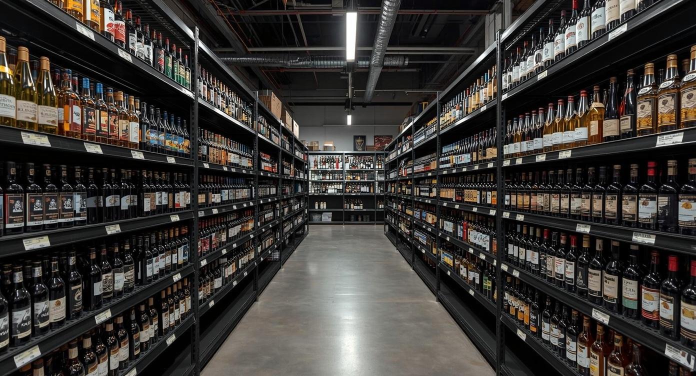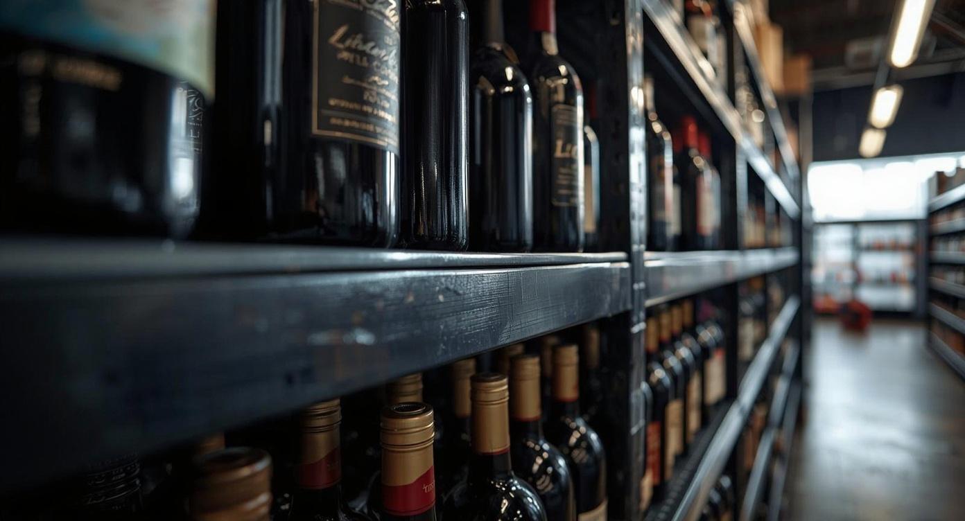 Heavy-duty steel shelving with adjustable tiers is ideal. It supports heavy glass bottles and can adapt to different product sizes.
